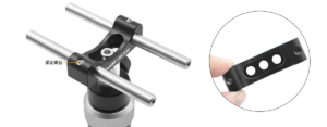 (2) First mount the bracket onto two cage rods and secure the rods using the top set screws. Then mount the cage system to the post via the countersunk hole.