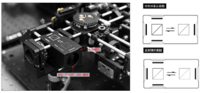 (3) The cube housing is equipped with four SM1 (1.035″-40) threaded ports, with four 4-40 threaded holes surrounding each port for compatibility with 30 mm cage systems. A beam path diagram is laser-marked on the housing surface to indicate the direction of light passing through the cube. The internal optical components are oriented in a single direction relative to the cube base, making correct orientation of the entire cube assembly critical in the setup.