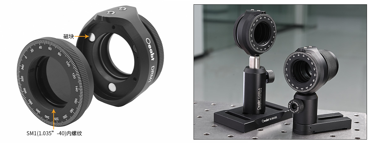 • The DRM1 is equipped with two independently rotating magnetic mounting rings, which can rotate continuously at 360° and have angular adjustment with 2° laser graduation. This guarantees precise positioning and consistency of optical components during rotation. The mounting hole features an SM1 (1.035”-40) internal thread, supporting the installation of 1-inch (Ø1″) optical components with a maximum thickness of 6.4mm using the included retaining ring.