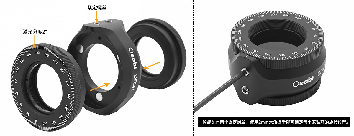 The DRM1 is equipped with two independently rotating magnetic mounting rings, enabling 360° continuous rotation and angular adjustment with 2° laser graduation. This ensures precise positioning and consistency of optical components during rotation.