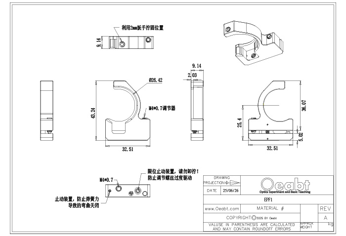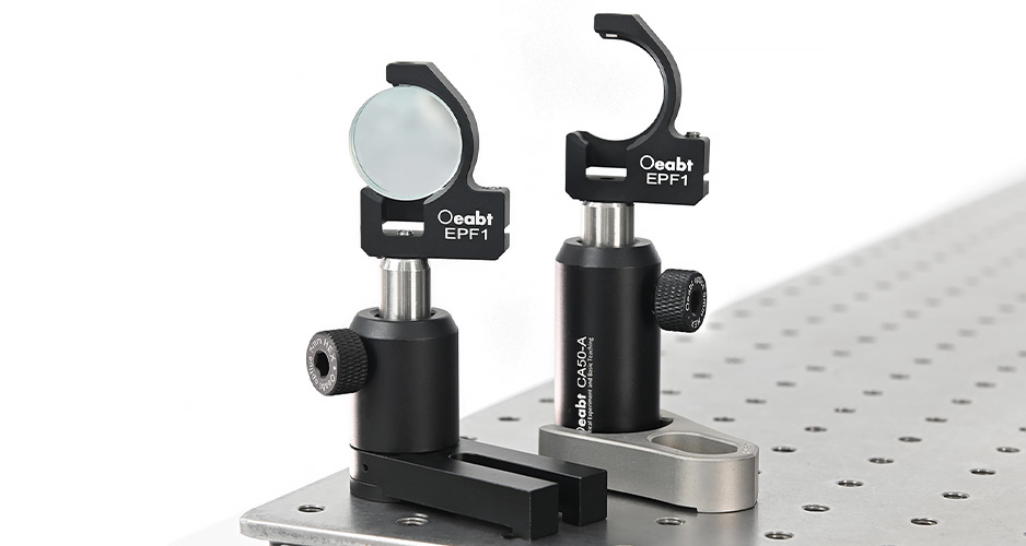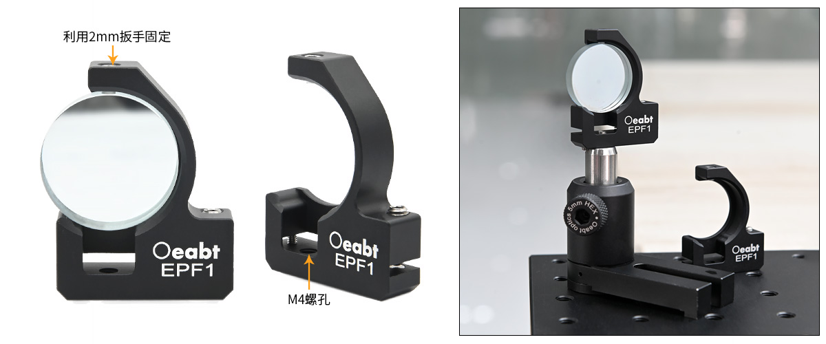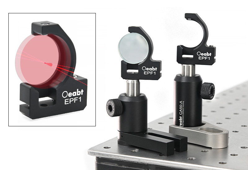 - The EPF1 adjustment mount adopts a one-piece flexible design. A fine-tuning tilt adjustment screw with a 2mm hex head provides a tilt adjustment range of ±4°. Its 120° frameless design allows light beams to pass freely near the outer diameter area of the optical component, avoiding obstruction by the front housing of the adjustment mount. This is very suitable for two light beams with near-normal incidence angles or for separating one light beam from two closely propagating light beams.