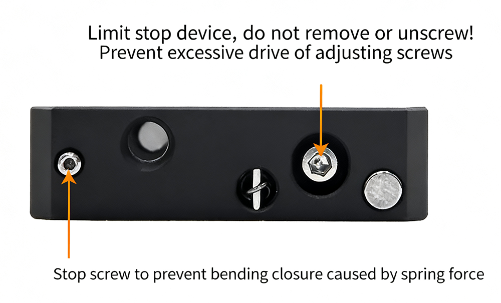 - To prevent over-adjustment, please note: Do not over-tighten the adjuster, as this may break the pin! Do not remove or unscrew the limit screw! The limit screw can effectively prevent the adjustment mount from over-extending. Forcibly twisting beyond the angle of the limit block will damage the adjustment mount.