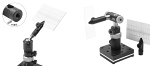 The flexible holding arm is a simple, compact mount designed for clamping flat optical components or other thin elements (0.8-2.3mm thick), such as colored glass filters, neutral density filters, and test targets.