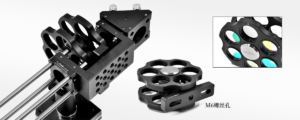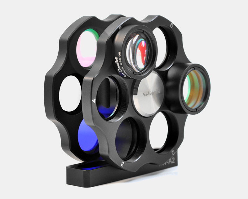 The filter wheel is designed to mount 12 Ø1/2-inch (Ø12.5mm) filters and can rotate independently. Filters are secured in place using the included retaining rings. Each filter port features standard SM1 (1.035″-40) threads, enabling the filter wheel to be compatible with other SM-threaded components. The FWO-A1 dual-wheel filter wheel can mount 6 Ø1-inch (Ø25mm) filters on each wheel respectively.