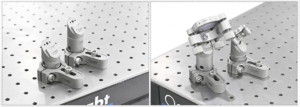 (1) The MA45-V can mount optical adjustment frames at a 45° angle relative to optical platforms, breadboards, or workbenches. The adapter is made of heat-treated 304 stainless steel, which has a relatively low coefficient of thermal expansion (CTE). Heat treatment eliminates internal stress in the material, avoiding thermal hysteresis. Therefore, we recommend using compatible low-drift components of the same series for matching installation.