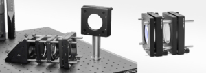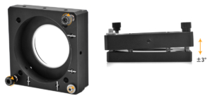 The mount enables ±3° of pitch and tilt adjustment for optical components. Adjustment is driven by three 100 TPI (Threads Per Inch) screws for smooth, highresolution motion. These adjusters feature locking collars and removable knobs.