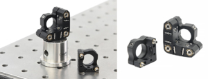 The adjustment mounts provide ±4° pitch and yaw adjustment for Ø1/2-inch optical components, which are fixed via nylon-tipped set screws.