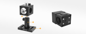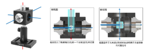 (2) The mount features four optical ports and provides two vertical optical paths for measuring transmittance and fluorescence. As shown in the figure below, the two optical axes (blue lines) and the rod mount axis (red line) share a common orthogonal intersection point. In free-space applications, this point allows users to rotate the holder while maintaining optical axis alignment.