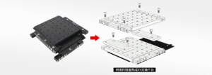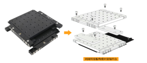 In addition, the OPSMB series adapter plates can be used to configure the translation stage into a dualaxis XY setup, further expanding its applications. Note that these plates are only compatible with the same series of stages. The assembled dualaxis stage has a working height of 32.75 mm and provides full travel in both X and Y directions.