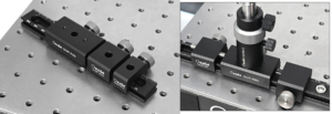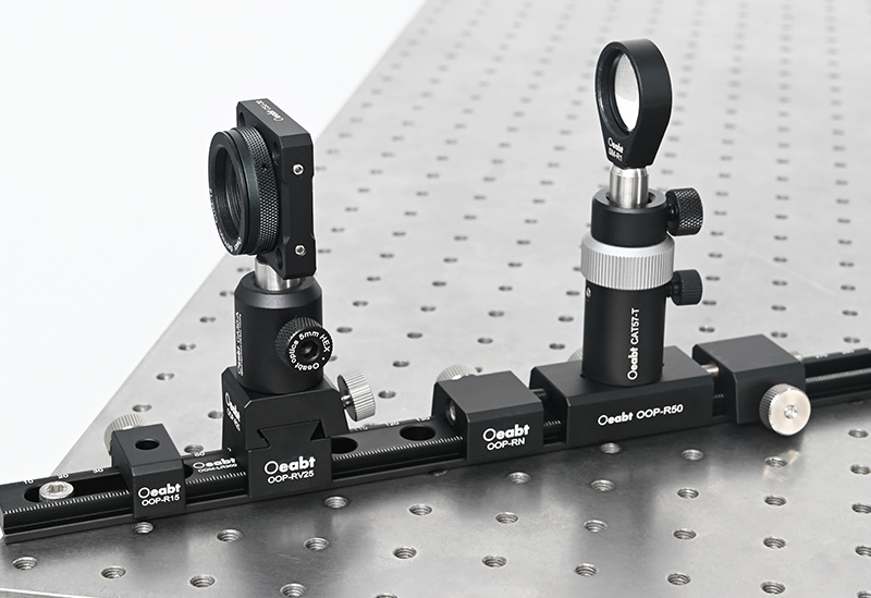 (4) The OOP-RP positioning carriage and OOP-RN return carriage assist in the fine adjustment movement of optical components mounted on dovetail rail carriages. When used in combination, they provide precise alignment from two directions along the rail axis. The OOP-RP positioning carriage includes an adjustment screw with a 26mm stroke, while the OOP-RN return carriage has a built-in spring plunger that delivers stability during actuation and enables finer, smoother movement compared to manual rough adjustment.