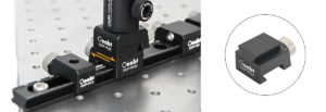 (2) The OOP-R series rail carriages are designed to mount components onto OOM-LR series dovetail rails. The carriages can be snapped into place anywhere along the length of the rail without the need for installation from the rail ends. A single M6 counterbore is machined on the surface for mounting opto-mechanical components. Precision machining ensures excellent lateral alignment during translation along the rail length, and a side thumb screw locks the position in place.