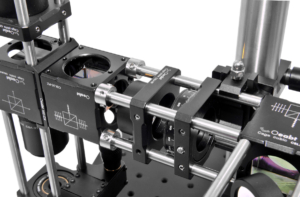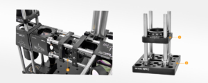 (3) The M3 threaded end can attach directly to the OPSM2 universal base plate to vertically mount a 30 mm cage assembly. Multithreaded hole arrays allow component mounting in all directions, increasing the flexibility of optical setups.