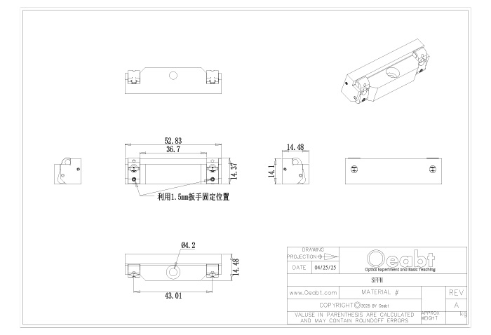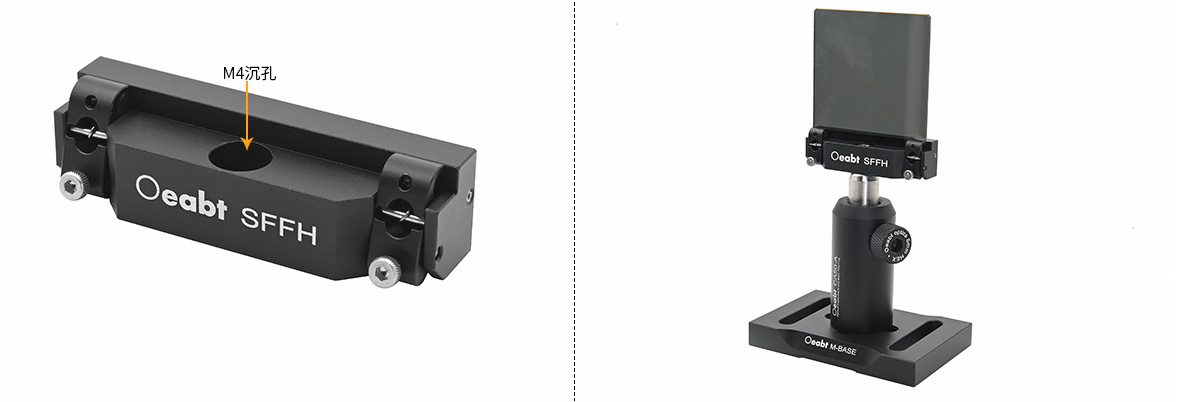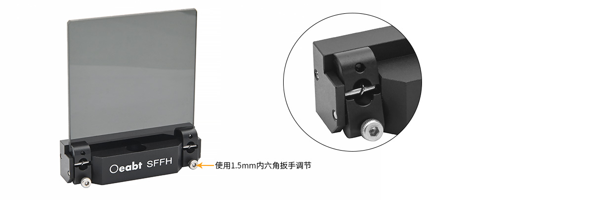 • The SFFH quick-release filter holder is suitable for applications requiring frequent filter replacement. It features a dual-arm locking structure, with each support arm equipped with an M2 screw-driven locking device. The clamping force is manually adjusted using a 1.5mm hex key to control the fixation of optical components.