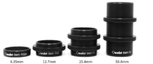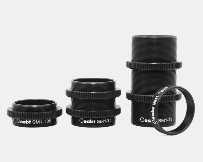 (1) The SM1-T series lens sleeve connectors are designed for connecting two lens tubes with SM1 internal threads at both ends. Equipped with full-length external threads, the connectors allow for the optimization of the position and angle of connected components, with the tube length varying upon directional adjustment. Lock rings are included (not provided with SM1-T025), enabling hand-tightening of the connected assemblies. These adapters feature a light-tight design, making them ideal for integrating with existing lens tube systems or cage systems.