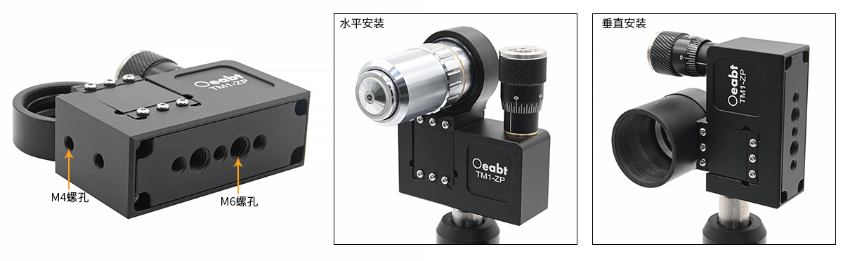 - The base of the TM1-ZP mount integrates 3 M4 threaded holes and 2 M6 threaded holes, and 2 additional M4 threaded holes are provided on the side. It can be flexibly matched with any Ø1/2 inch rods or mounting plates, supporting vertical or horizontal installation configurations.